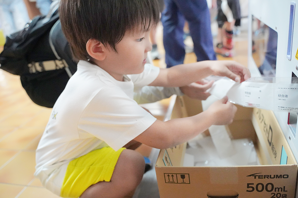 参加した子どもたちは、お菓子を一つずつコンベアに入れたり、粉末を量ったりと、実際の調剤業務に近い作業に挑戦。出来上がった「薬剤」に異物が混入していないかを確認し、薬袋も手書きで作成するなど、本格的な内容に真剣な表情で取り組んでいました。
