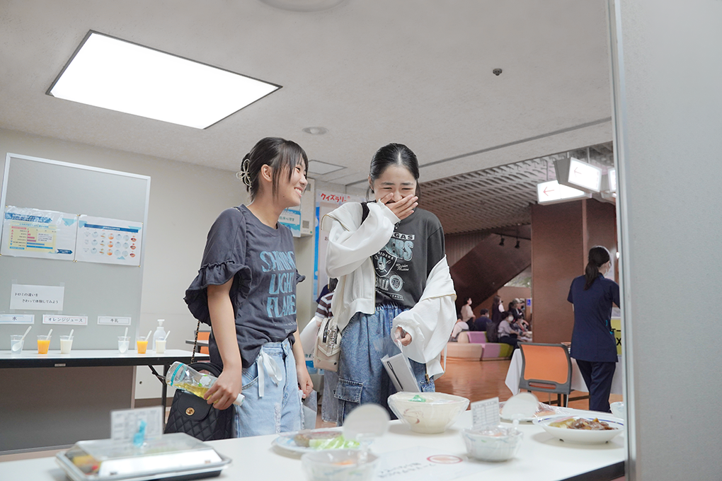栄養管理室ブースでは実際の大きさ、重さの「体脂肪1kg」のモデルを受付のど真ん中に鎮座させ、来場者をお迎えしました。多くの大人の来場者がこの「体脂肪1kg」に興味を示し、栄養管理室ブースのつかみは成功しました。病院栄養士の仕事紹介パネルでは病院管理栄養士に親子で興味を持ってくださり説明させていただきました。毎回人気がある「水分のトロミ付け体験」は未就学児・小学生が参加し顔は真剣そのもので様々な異なるトロミ水を作成し、初めての食感に盛り上がっていました。アンケートを記載してくださった方にお湯を入れたら出来上がる「α化米おにぎり」をプレゼントしたのですが、今回の栄養ブース参加されたことで病院給食~外食~栄養知識~非常食まで幅広く興味を持っていただけたと思います。