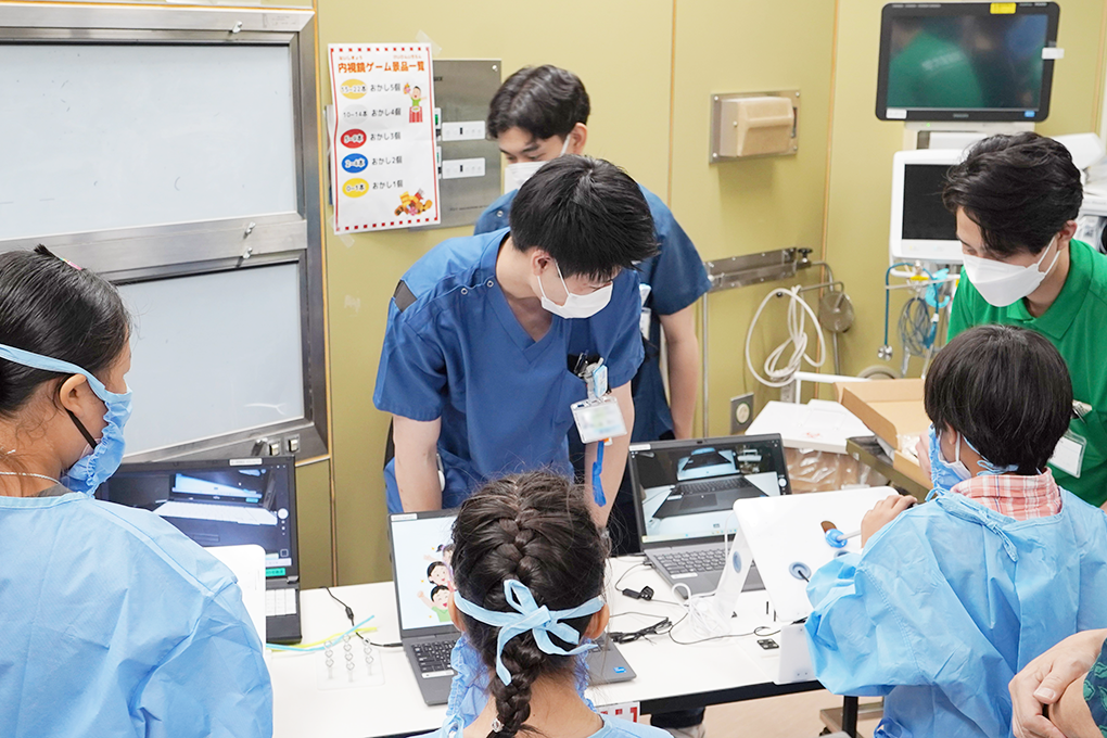 臨床工学技士室では本年度、「手術室業務」と「透析室業務」の体験コーナーを開催いたしました。 手術室では手術ガウンの着用や内視鏡操作、模擬心臓を用いたペースメーカーのリード植込み体験、電気メス体験などを行い、子どもたちは真剣な表情で挑戦し、ご家族も笑顔で応援されていました。