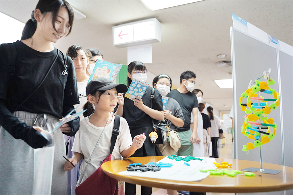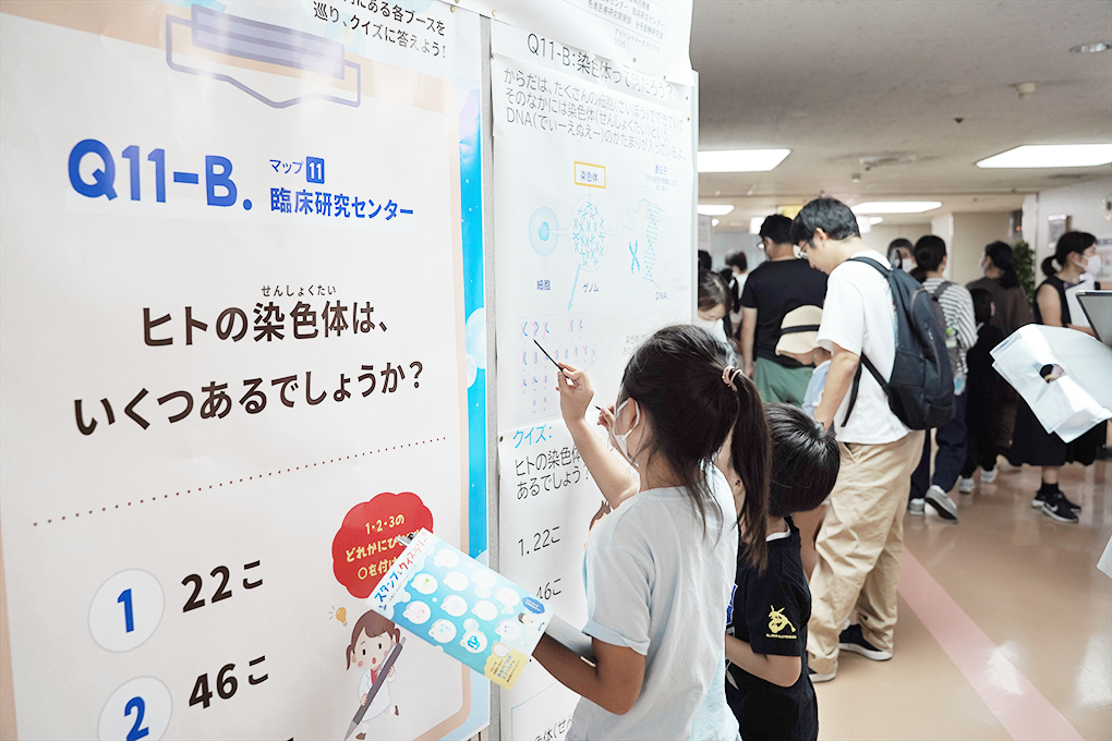 生物の体の特徴を記録し、次の世代に伝えていく生命現象を「遺伝」といい、その「遺伝」を担う本体を「遺伝子」といいます。臨床研究センターでは、遺伝子の変異を原因とする疾患の診断や治療の開発を目指して、日々研究を進めています。今回のイベントでは、遺伝の重要な要素である「染色体」「DNA」「遺伝子」「遺伝子の変化と病気」について、クイズ形式で学んでもらいました。