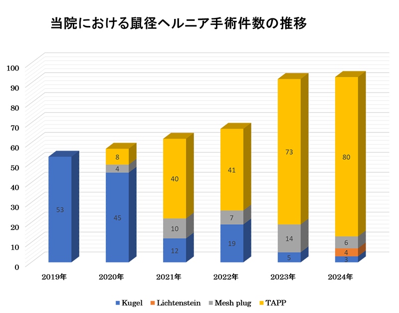 当院では年間100例を超える腹部ヘルニア手術を実施しております。学会や論文で知見を広げるだけでなく、手術見学や手術応援などを活用して柔軟に新しい手術手技を取り入れ、日々診療内容のupdateに努めております。しかし残念ながら当院でヘルニア手術を受けることができることを知らなかったとの患者さんの声をたびたび耳にします。当院でも安心して腹部のヘルニア診療を受けることができることを知っていただけるよう、このたび「おなかのヘルニアセンター」を設立することといたしました。