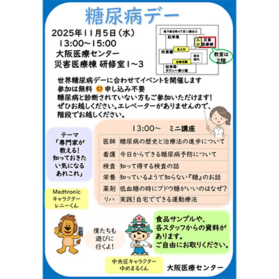 世界糖尿病デーに合わせてイベントを開催します 日時:2025年11月5日(水) 13:00~15:00 場所:災害医療棟 2階 研修室1~3 参加無料 申し込み不要 糖尿病と診断されていない方もご参加いただけます! 皆様、ぜひお越しください ←左図をクリックすると拡大されます |