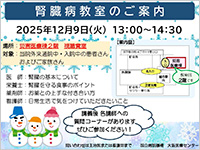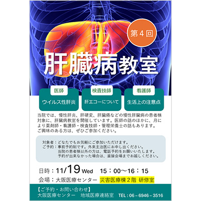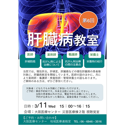 対象:当院外来通院中の患者さんおよびご家族 日時:2026年3月4日(水) PM1:30〜3:00 (変更の場合あり、詳細はポスターをご参照ください。) 場所:災害医療棟 2階 視聴覚室 注意)事前予約が必要となります 主治医へ受講希望を伝えるか、06-6942-1331(代表)へお電話の上、栄養士へ取り次いでいただくようお伝えください。 ←左図をクリックすると拡大されます |