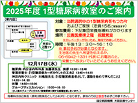 対象:当院通院中の1型糖尿病をもつ方 およびご家族(定員15名ご家族含まず) 参加費用:集団栄養指導料がかかります 場所:災害医療棟2階 視聴覚室 ※エレベーターがないため、階段でお越しください。 日時:2025年12月17日(水) PM1:30〜4:10 注意:事前予約が必要となります。 変更の場合があります。詳細はポスターをご参照ください。 主治医の先生へ希望を伝えるか、06-6942-1331(代表)にお電話の上、栄養士へ取次いでいただくようお伝えください。 ←左図をクリックすると拡大されます |
