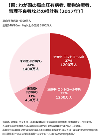 血圧が120/80㎜Hgを超えて高くなると脳疾患病、慢性腎臓病などにかかる確率や死亡する確率が高くなることが知られています。2016年の国民健康・栄養調査によると、我が国の高血圧有病率(収縮期血圧140mmHg以上または拡張期血圧90㎜Hg以上、または降圧薬内服中)は40-74歳で男性60%、女性41%、75歳以上では男性74%、女性77%と報告されており、高血圧患者数はおおよそ4300万人と推定されています。日本人高血圧患者の85-90%は、原因がはっきり分からない本態性高血圧症といわれており、元々高血圧になりやすい体質や、塩分摂取過多、肥満、過度の飲酒、運動不足、ストレス、喫煙などが原因で発症するとされています。一方、二次性高血圧症(日本人の高血圧患者の10-15%)とは、特定の原因(ホルモン分泌異常、腎臓病、薬剤)などが原因で起こる高血圧症であり、この二次性高血圧症の中でも特に重要な疾患として原発性アルドステロン症があります。